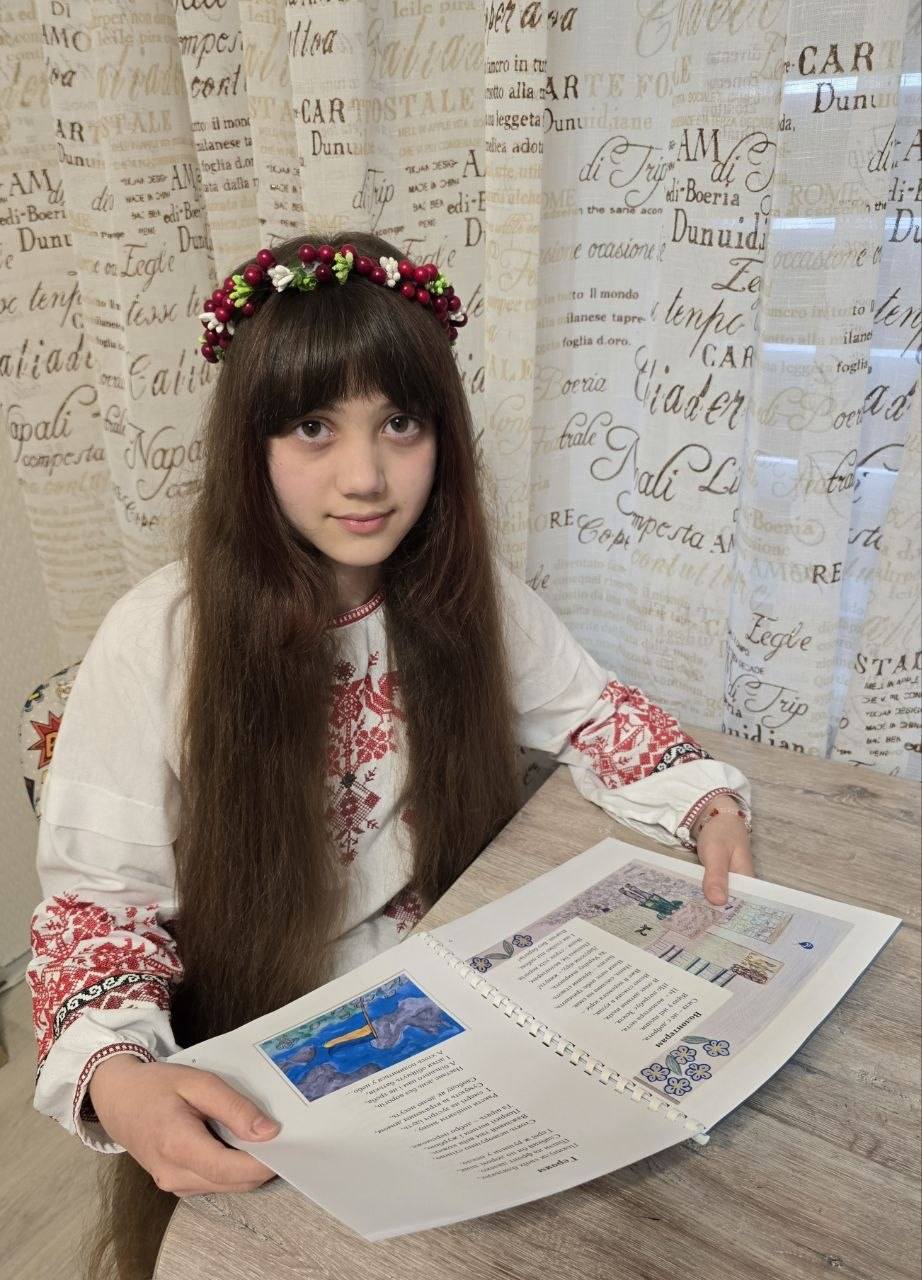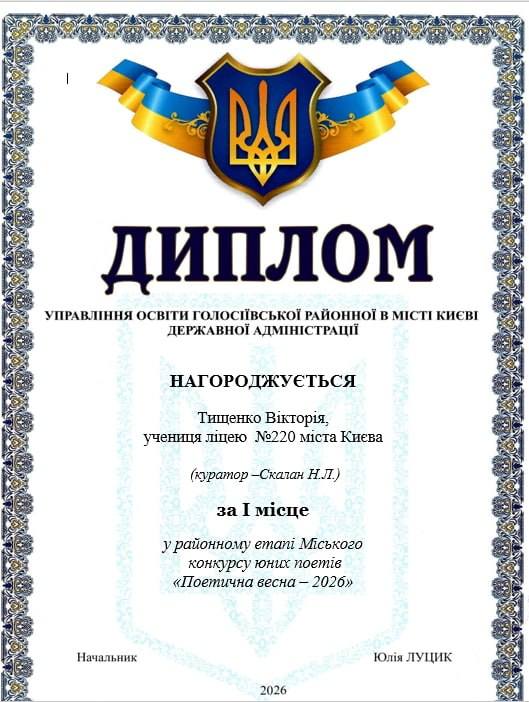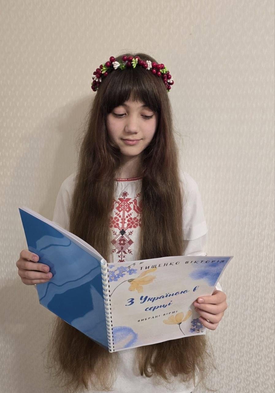 Тищенко Вікторія, учениця 5-Г класу посіла І місце у районному етапі Міського конкурсу юних поетів «Поетична весна-2026», представивши авторську збірку поезій «З Україною в серці», яку вона проілюструвала власними малюнками.